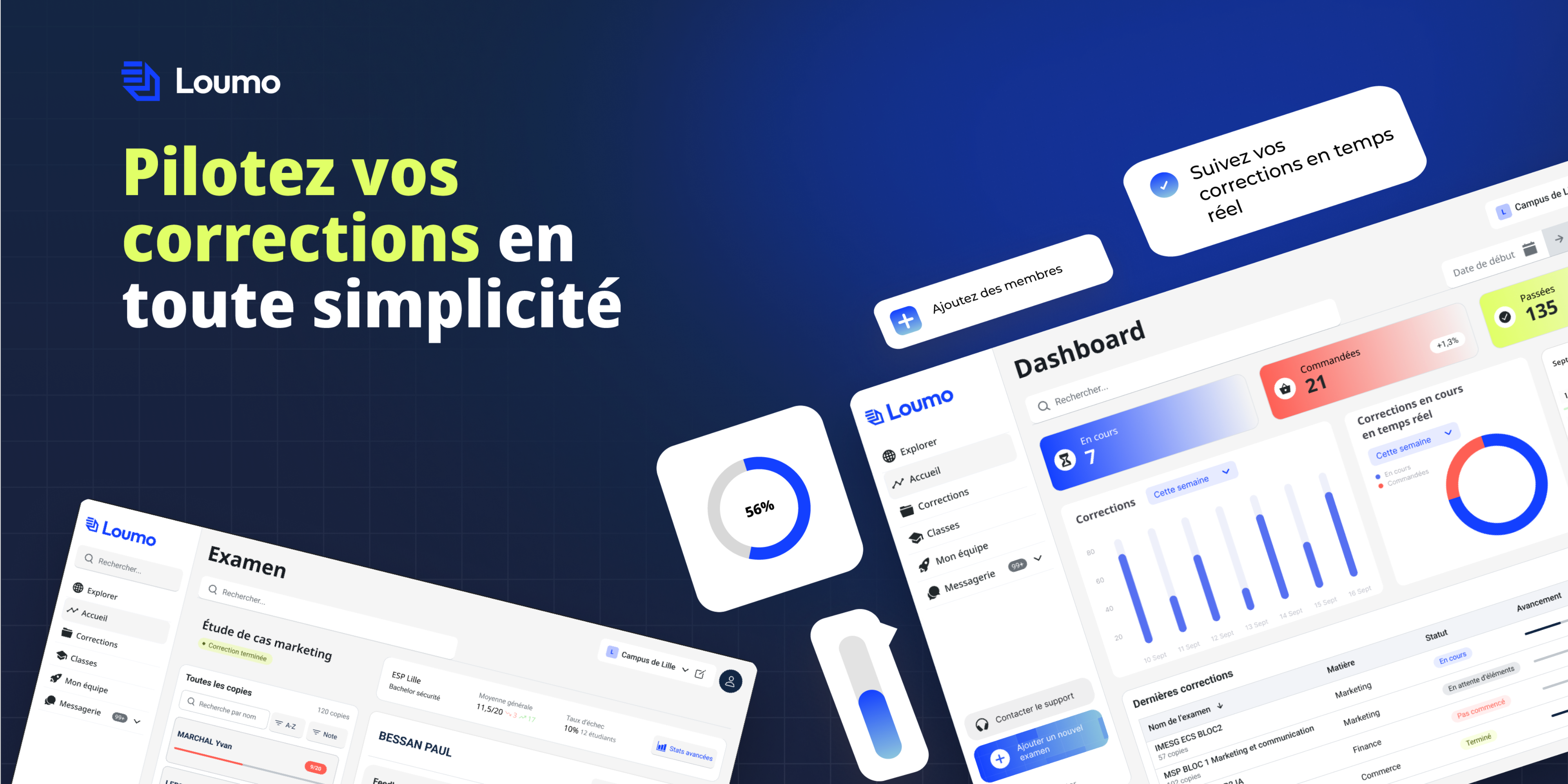 Autonomie locale : Chaque collaborateur dispose d'un accès dédié à son établissement pour déposer les sujets et les copies. Cette interface unique permet de suivre l'avancement des corrections, de gérer les imprévus en lien avec les équipes de Loumo et de centraliser l'ensemble des résultats.